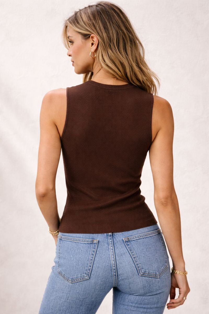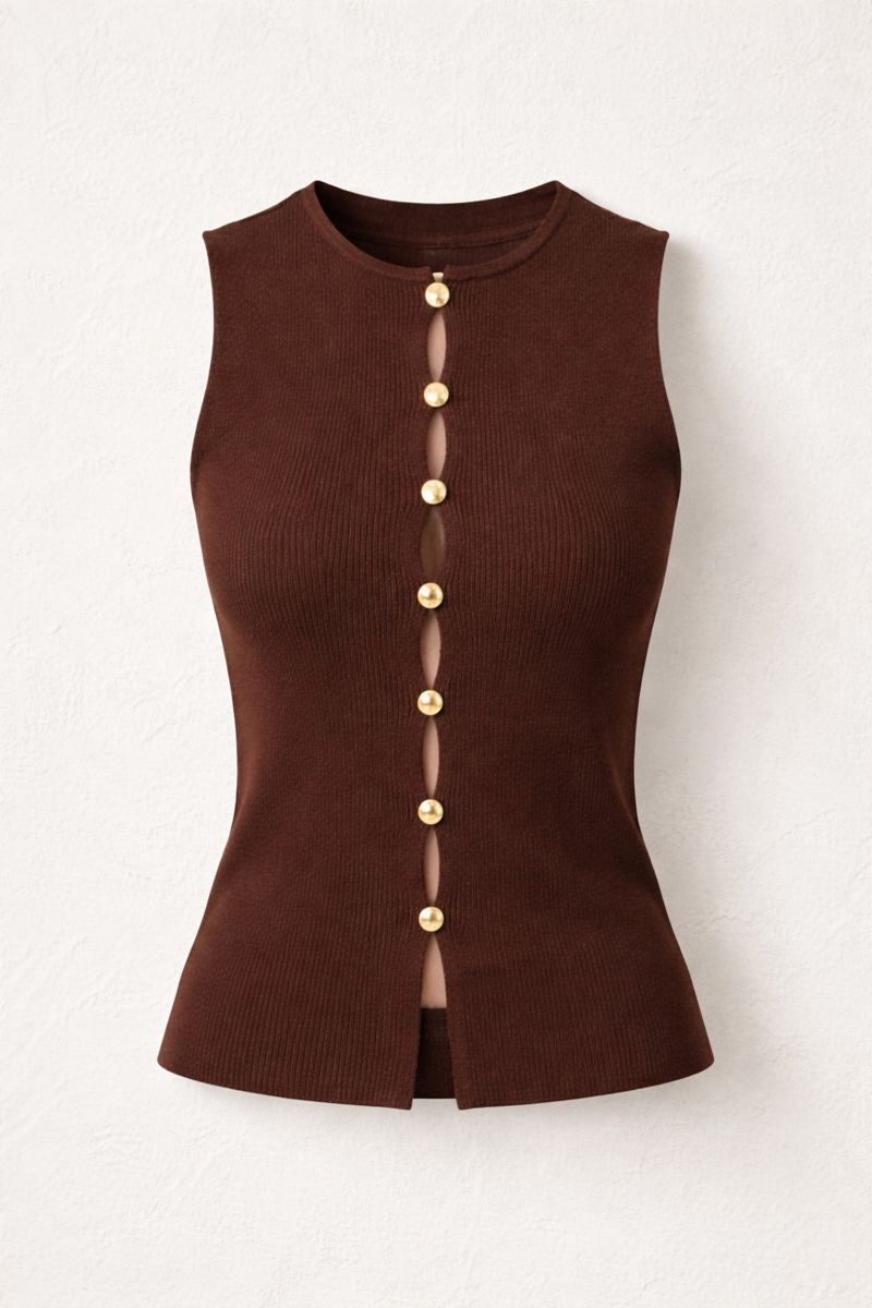 Este chaleco sin mangas en punto canalé redefine el estilo minimalista con detalles que marcan la diferencia. El color burdeos intenso le aporta una elegancia sofisticada, mientras que los botones dorados frontales se convierten en el foco perfecto para elevar cualquier look.